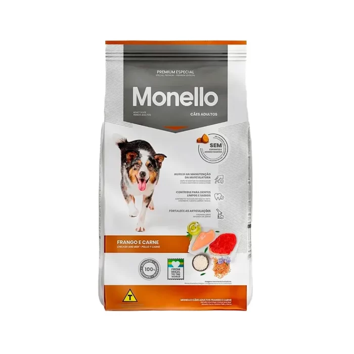 MONELLO PERRO ADULTO POLLO Y CARNE es un alimento formulado para proveer los nutrientes necesarios al desarrollo sano de perros adultos en diferentes etapas de la vida. Sin colorantes y aromatizantes artificiales, el alimento es producido con ingredientes de excelencia y proteínas de alta digestibilidad, dándoles así más energía y vitalidad a las mascotas. La adición de hexametafosfato de Sodio cuida la salud bucal, y previene el sarro y problemas relacionados a la acumulación de bacterias. La glucosamina y la condroitina incluidas en la fórmula actúan en el fortalecimiento de las articulaciones, mientras el alto índice de proteína ayuda en el mantenimiento de la musculatura, por lo cual propicia más bienestar a los peludos. Monello Perros Adultos aún posee linaza, un ingrediente que actúa en la salud y belleza de la piel y pelo de las mascotas.
