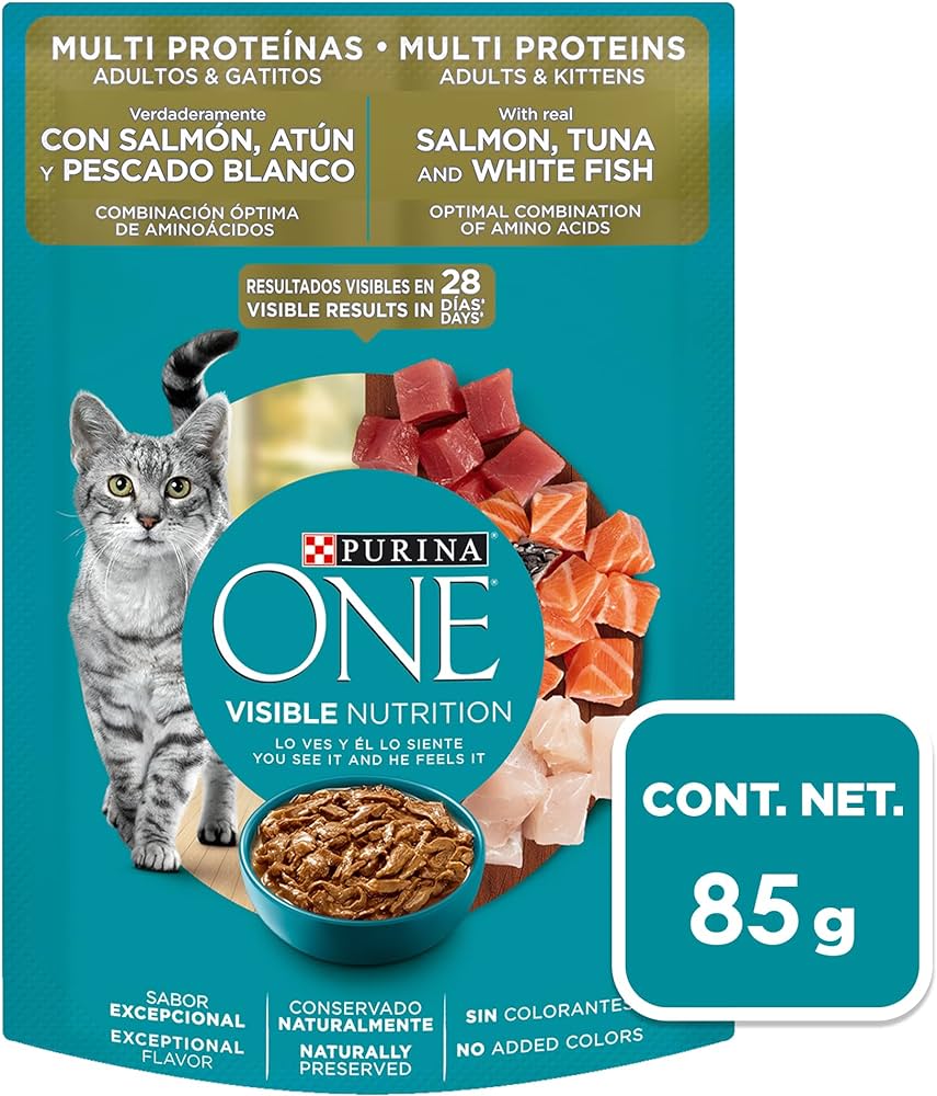 Purina One Sobre Multi Proteínas Adultos y Gatitos de todos los tamaños es un alimento húmedo con Salmón, Atún y Pescado Blanco con exquisito sabor y combinación optima de aminoácidos fundamentales para la vida que ayudan a enriquecer la nutrición de tu gato.